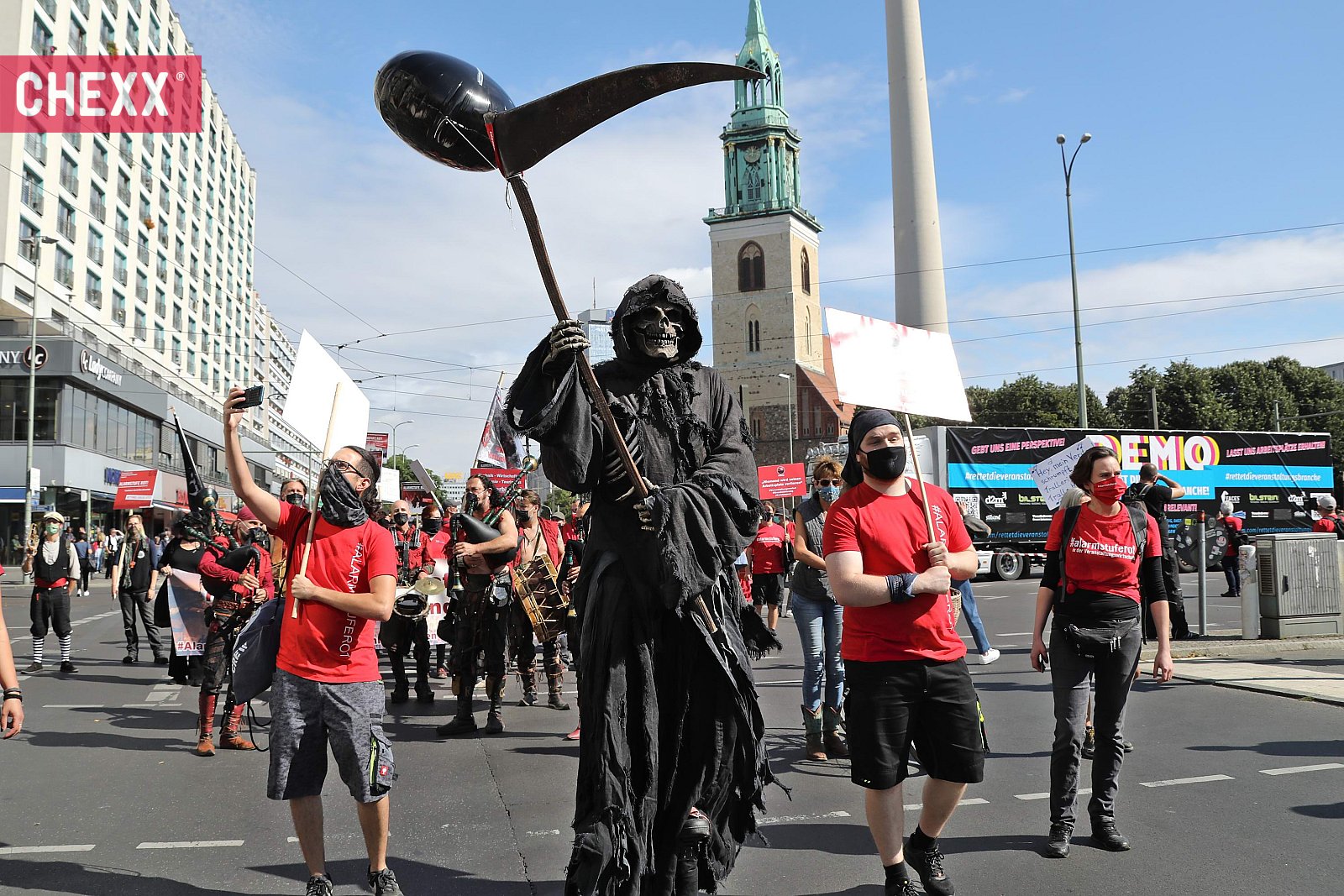 Bestens durchorganisert war die Demo #AlarmstufeRot der Veranstaltungswirtschaft, einer Allianz aus Initiativen, Verbänden und Vereinen. Der sechstgrößte Wirtschaftszweig Deutschlands mit ehemals 130.000.000.000 Euro Umsatz und 1.000.000 direkt Beschäftigten steht seit Beginn der Corona-Krise still und steht kurz vor dem Kollaps. Auf der Demo waren auch Corvus Corax und Markus Maria Profitlich zu sehen.